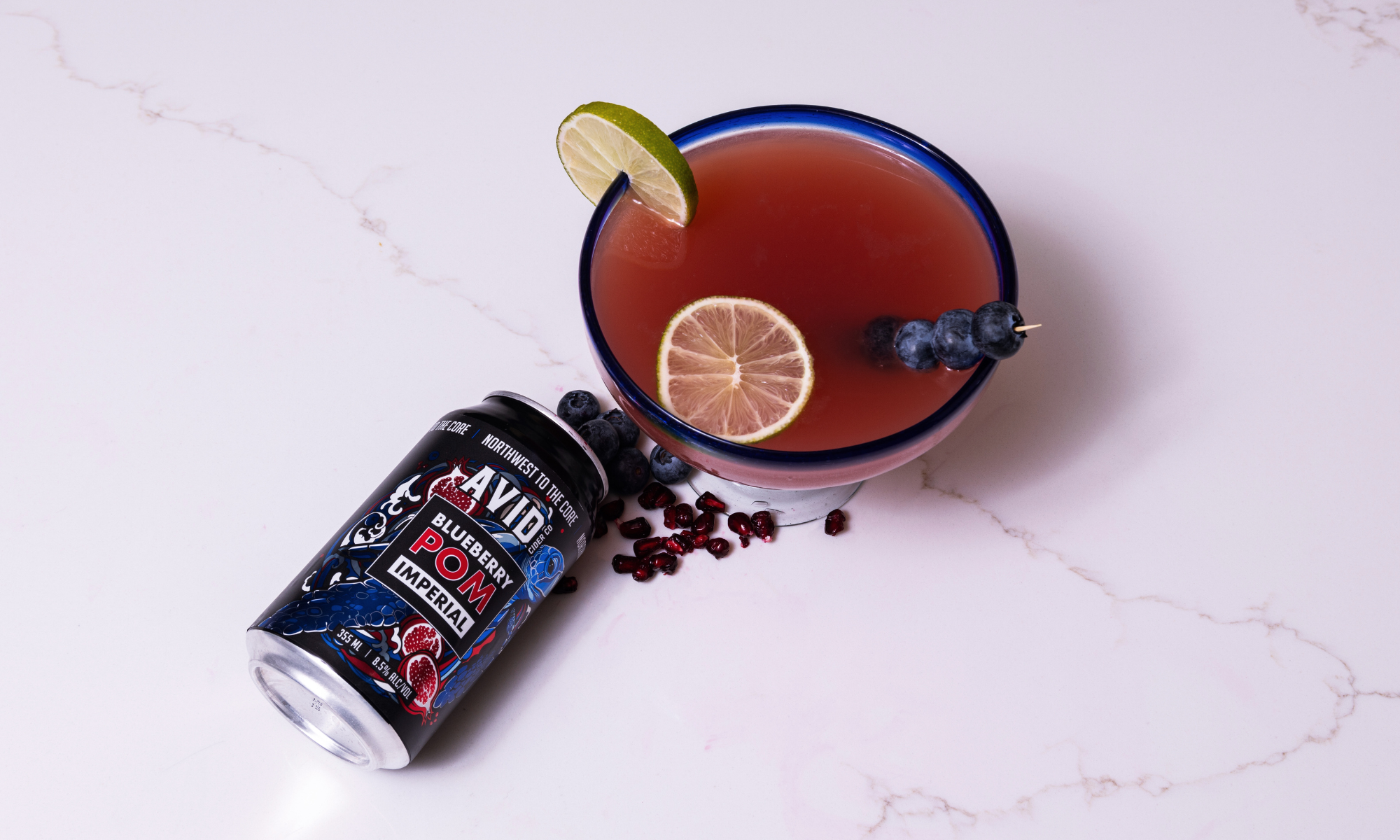 Place the blueberries in the bottom of a shaker and add pomegranate juice. muddle berries and juice. Add vodka, lime juice, and Cointreau. Fill with ice and share for 10-15 seconds. Double strain cocktail into Cosmo glass and top with Blueberry POM Imperial Cider. Garnish with lime wheel and blueberry skewer. Serve Straight Up.